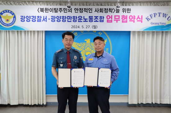 (전남=NSP통신) 김성철 기자 = 광양경찰서(서장 최병윤)는 광양항만항운노동조합(위원장 장한채)는 지난 27일 경찰서 2층 매화마루에서 경찰서장, 광양항만항운노동조합 위원장, 북한이탈주민 대표 등 11명이 참석한 가운데 업무협약을 체결하고 생활지원금을 전달했다.