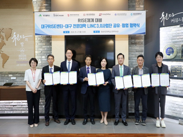 이날 협약식에는 대구광역시 최정숙 대학정책과장, RISE센터 김광석 센터장, 이옥렬 주무관과 대구지역 5개 전문대학(계명문화대학교, 대구과학대학교, 대구보건대학교, 영남이공대학교, 영진전문대학교) LINC3.0사업단장 등이 참석했다.