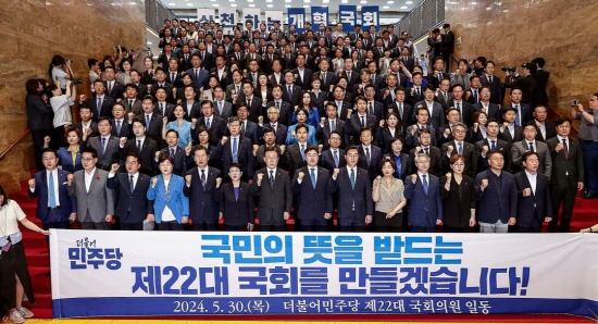 권향엽 의원은 국회 로텐더홀 계단에서 열린 더불어민주당 의원총회에 참석해 제22대 국회의원들과 함께 개원 각오를 다졌다.