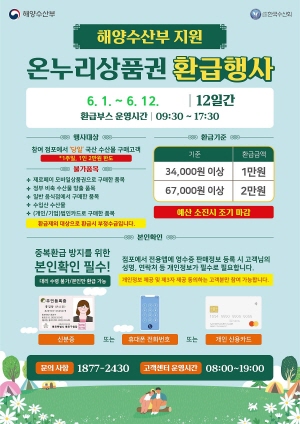 국내산수산물 온누리상품권 환급행사는 수산물 체감물가 완화와 소비 활성화를 도모하고자 매년 명절과 상반기에 집중 실시해 수산물 소비 촉진과 전통시장 활성화에 기여하고 있다.