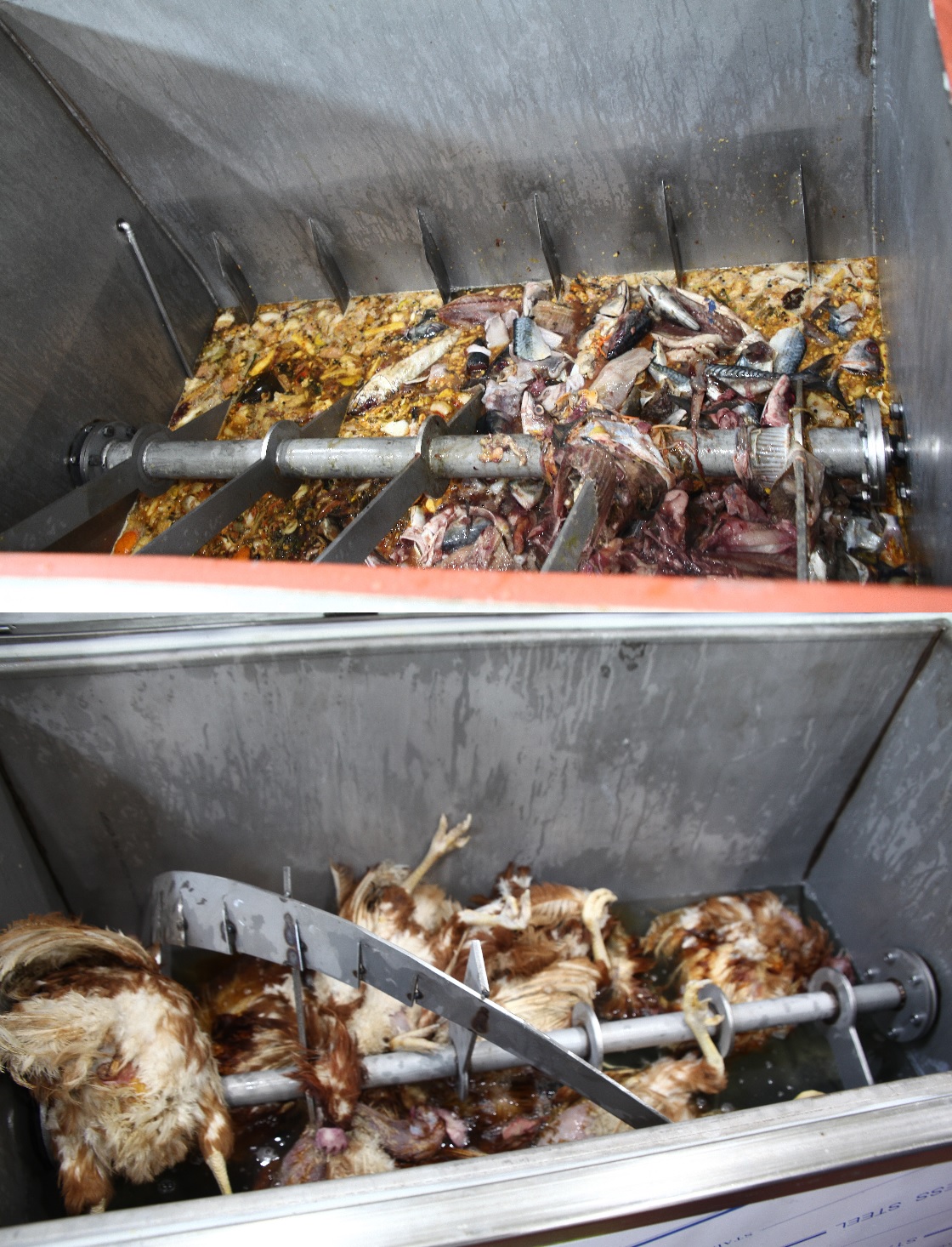 음식물 쓰레기와 생선폐기물(사진 위), 닭 폐사체를 시연 기계에 넣은 모습. (사진 = 김종식 기자)
