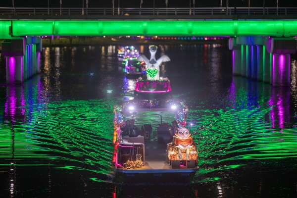수상 퍼레이드는 총 8척의 선박에 순천만습지와 국가정원을 상징하는 짱뚱어, 칠게, 흑두루미 등의 캐릭터 조형물로 연출하고 야간에 형형색색 조명을 더해 무리 지어 이동하는 모습은 동천변 야간경관과 어우러져 색다른 볼거리를 제공한다.