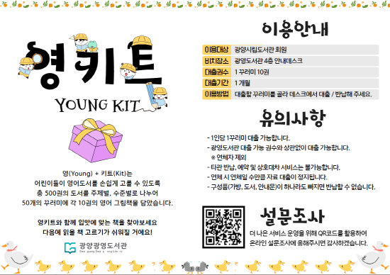 (전남=NSP통신) 김성철 기자 = 광양광영도서관이 영어 주제특화 서비스의 하나로 영어책 꾸러미 ‘영키트’ 대출 서비스를 운영한다고 밝혔다.