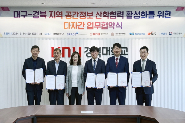 (경북=NSP통신) 김대원 기자 = 경북대학교는 14일 경북대 공과대학 회의실에서 대구·경북지역 공간정보 산학협력 활성화를 위해 공간정보산업진흥원, 대구과학대, 이지스, 우경정보통신과 5자 간 업무협약을 체결했다.