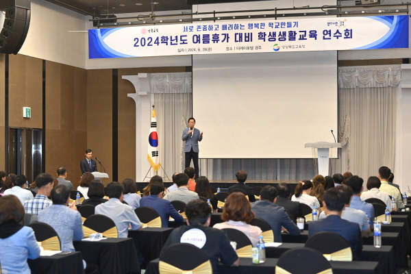 (경북=NSP통신) 조인호 기자 = 경상북도교육청(교육감 임종식)은 28일 경주시에 있는 더케이호텔 경주에서 도내 22개 지구학생생활교육위원장교 교감과 교육지원청 학생 생활교육 업무 담당 장학사 등 50여 명이 참석한 가운데 2024학년도 여름휴가 대비 학생 생활교육 연수회를 개최했다.