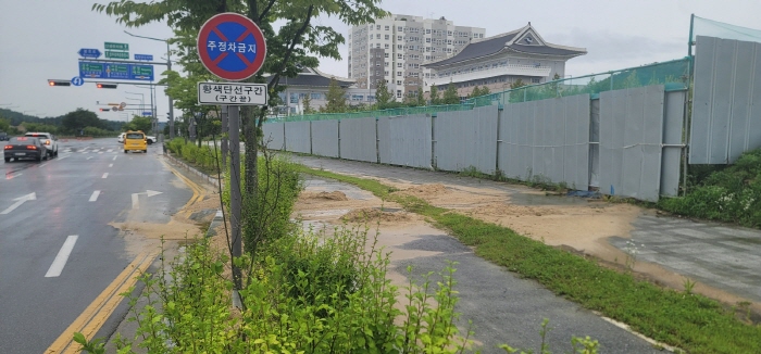 예천군 도청신도시 일대 여성가족센터 네거리에 지난 9일 오전, 건설현장에서 많은 양의 토사가 빗물에 섞여 유출돼 보도와 자전거도로, 배수로 스틸그레이팅을 뒤덥으며 도로 및 주민 정주 환경을 파괴하고 있다.