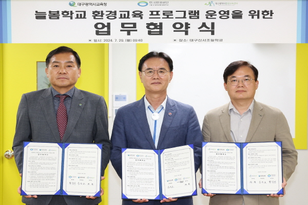 (경북=NSP통신) 김대원 기자 = 대구시교육청(교육감 강은희)은 29일 대구신서초등학교에서 한국환경공단 대구경북환경본부, 대구환경교육센터 등 2개 기관과 ‘늘봄학교 환경교육 프로그램 운영’ 을 위한 업무협약을 체결했다.