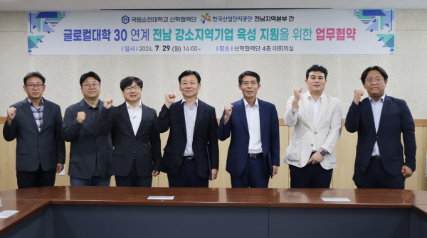 (전남=NSP통신) 남정민 기자 = 국립순천대학교(총장 이병운)와 한국산업단지공단 전남지역본부(본부장 염동일)는 최근 순천대 산학협력관 대회의실에서 ‘글로컬대학 30 연계 전남 강소지역기업 육성 지원을 위한 업무협약’을 체결했다고 30일 밝혔다.