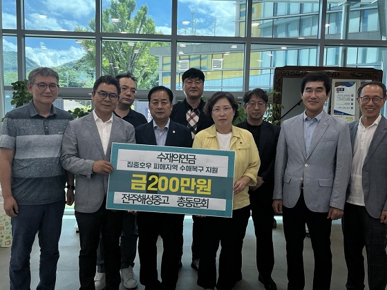 (전북=NSP통신) 김광석 기자 = 전주해성중·고 총동창회가 지난달 31일 완주군 운주면을 방문해 지난 달 집중 호우로 큰 피해를 본 이웃을 위해 사용해 달라며 수재의연금 200만원을 기탁했다.