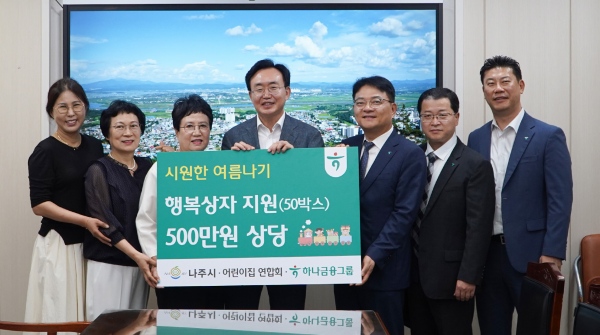 (전남=NSP통신) 김용재 기자 = 하나금융그룹(회장 함영주)이 나주시어린이집연합회(회장 김귀순)과 함께 무더위에 지친 취약계층을 돕기 위해 특별한 선물을 전달했다.