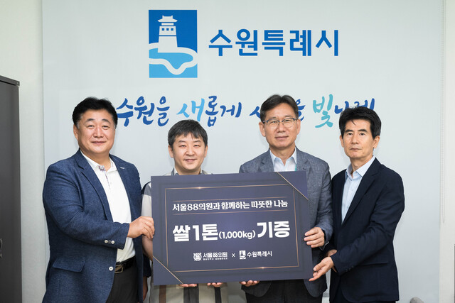 수원시 복지여성국장 집무실에서 열린 전달식에는 김인배 수원시 복지여성국장, 정혜두 서울88의원 대표원장, 조성호 밤밭노인복지관장 등이 참석했다.