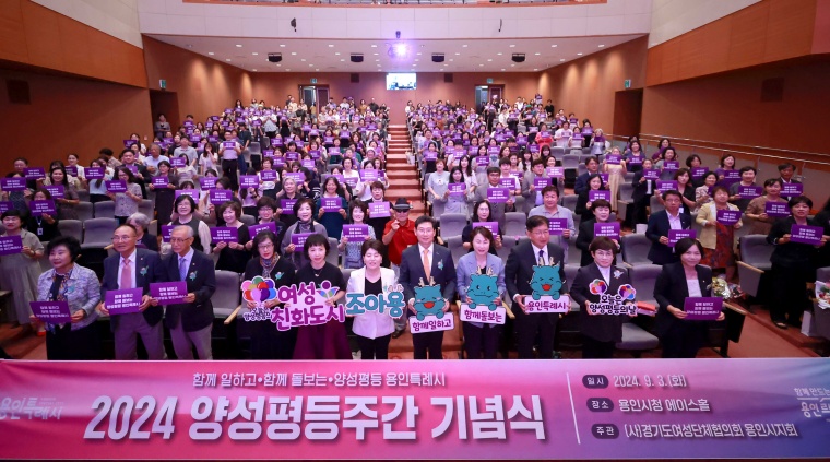 시는 양성평등주간(9월 1일~7일)을 기념해 매년 양성평등에 대한 의미를 알리고 공감대를 형성하기 위한 기념식을 여는데 올해 주제는 ‘함께 일하고, 함께 돌보는 양성평등한 용인특례시’로 정했다.