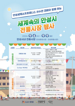 (경기=NSP통신) 김병관 기자 = 안성의 전통시장인 안성중앙시장, 안성맞춤시장에서 상인회 주관으로 안성시 세계소프트테니스 선수권 대회에 맞춰 다양한 행사가 진행된다.