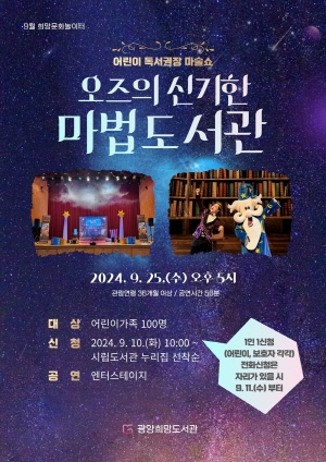 (전남=NSP통신) 김성철 기자 = 광양희망도서관이 9월 25일 오후 5시 광양희망도서관 꿈나무극장에서 어린이 가족 100여 명을 대상으로 ‘오즈의 신기한 마법도서관’ 공연을 운영한다고 밝혔다.