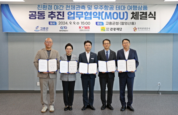 (전남=NSP통신) 남정민 기자 = 전남 고흥군(군수 공영민)은 최근 고흥군청에서 한국관광공사 광주전남지사, 전라남도 관광재단, 광주광역시 관광공사, 국립청소년우주센터와 함께 야간 천체관측 및 우주항공 테마 여행상품 공동 추진을 위한 업무협약을 체결했다고 10일 밝혔다.