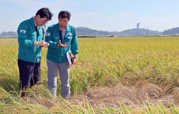 NSP통신-김성 장흥군수(사진 왼쪽)가 벼멸구 피해상황을 점검하고 있다.