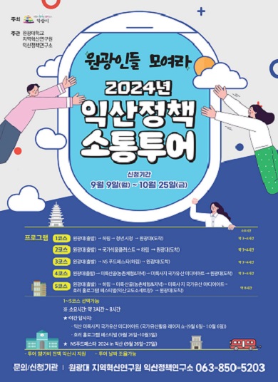 (전북=NSP통신) 김광석 기자 = 원광대학교(총장 박성태)와 익산시가 원광대 재학생 300명을 대상으로 2024학년도 2학기 중에 ‘2024 익산정책소통투어’ 현장체험학습을 진행한다.