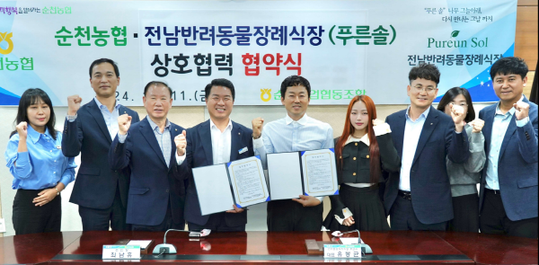 이에 따라 순천농협은 임직원들을 포함한 1만9000 여 명의 조합원들이 반려동물 삶의 질 향상을 위해 전남반려동물장례식장 푸른솔과 상호 협력하게 된다.