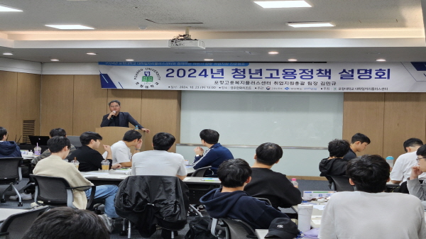(경북=NSP통신) 조인호 기자 = 포항대학교(총장 하민영)에서 운영 중인 대학일자리플러스센터에서는 지난 23일 경주 한화리조트에서 포항고용복지플러스센터 취업지원총괄 김민규 팀장을 강연자로 초빙해 포항대학교 재학생 대상으로 2024년 청년고용정책 설명회를 진행했다.