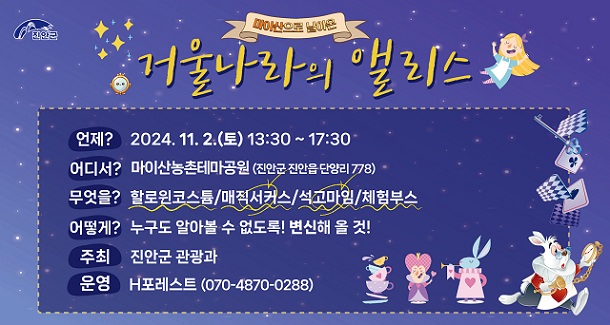 정난경 관광과장은 “야외활동 하기 좋은 가을날, ‘오늘 하루는 내가 마이산으로 날아온 앨리스’라고 생각하시면서 이색적인 분장과 행사장 분위기를 만끽하시는 소중한 시간 보내시길 바란다”고 말했다.