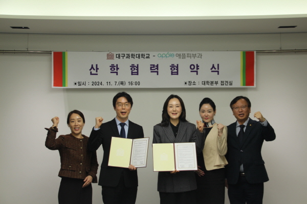 협약식에는 대구과학대 박지은 총장을 비롯한 보직교수들과 애플피부과의원 현동녘 원장 등 양 기관 주요 보직자들이 참석했다.