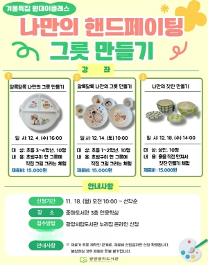 (전남=NSP통신) 김성철 기자 = 광양중마도서관은 12월 4일~18일까지 3회에 걸쳐 진행되는 원데이 클래스 ‘나만의 핸드페인팅 그릇 만들기’ 프로그램에 참여할 수강생을 모집한다고 밝혔다.