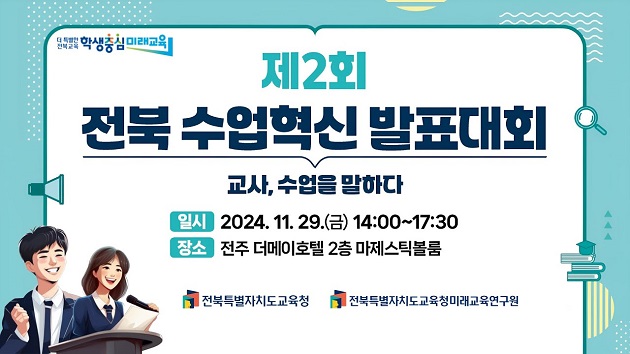 (전북=NSP통신) 김광석 기자 = 전북자치도교육청(교육감 서거석)이 주최하고, 전북자치도교육청미래교육연구원(원장 장익)이 주관하는 ‘제2회 전북 수업혁신 발표대회’ 본선 경연이 오는 29일 오후 2시 전주더메이호텔 마제스틱볼룸에서 개최된다.