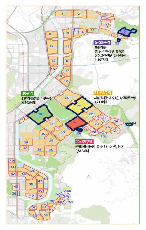 선도지구로 선정된 아파트 유형은 ▲기초구역29,S5(샛별마을 라이프·동성·우방·삼부, 현대 2843세대) ▲기초구역30(양지마을 금호·청구·한양 4392세대) ▲기초구역21,S4(시범단지 현대·우성, 장안타운건영3713세대)이며 유형별 안배를 고려해 별도 정비물량으로 선정된 연립주택 유형은 ▲기초구역6,S2(목련마을 대원·성환·두원·드래곤·삼정그린·미원·화성·대진 1107세대)이다.