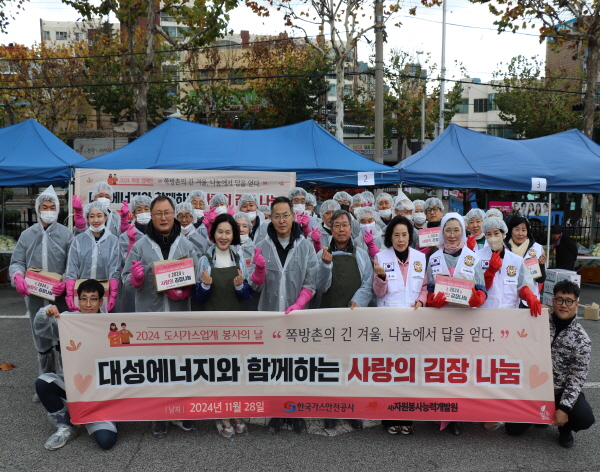 (경북=NSP통신) 김대원 기자 = 대성에너지(117580)는 28일 대구시 중구 명덕로 본사 주차장에서 한국가스안전공사 대구광역본부, 대구광역시 간호사회, 자원봉사능력개발원과 함께 ‘사랑의 김장 나눔’ 행사를 진행했다.