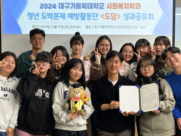 (경북=NSP통신) 김대원 기자 = 대구가톨릭대(총장 성한기) 사회복지학과 도박 문제 예방활동단 ‘도담’이 한국도박문제예방치유원과 사행산업통합감독위원회가 주관한 ‘2024 청소년·청년 도박 문제 예방활동단 사업’에서 최우수상을 받았다.