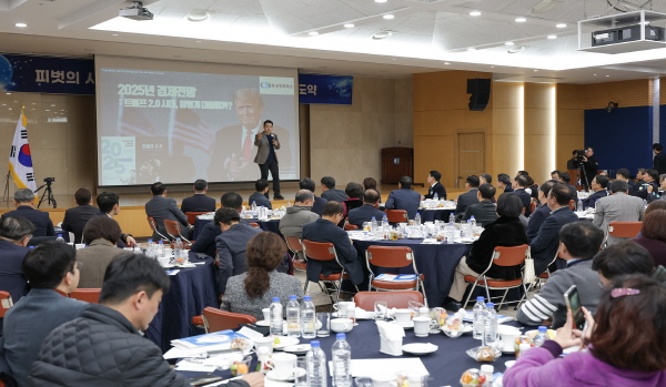 김광석 한국경제산업연구원 경제연구실장을 초청해 ‘2025년 경제전망 : 트럼프 2.0시대, 어떻게 대응할까?'라는 주제로 강연회를 실시했는데 트럼프 시대 세계경제 분석과 이에 대한 대응 방안을 소개했다.