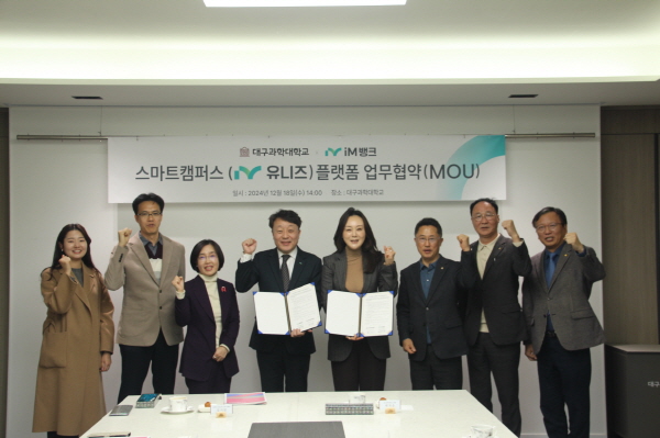 박지은 총장은 “급변하는 디지털 시대에 스마트 플랫폼의 중요성이 더욱 커지고 있다”며 “이번 협약이 iM뱅크를 MZ세대에 알리는 계기가 되고 대구과학대학의 경쟁력을 한층 성장시키는 기회가 되길 기대한다”고 말했다.