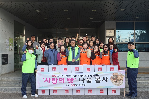 (전북=NSP통신) 김광석 기자 = OCI(456040) 군산공장(공장장 표상희, 노동조합위원장 장육남)과 군산희망틔움봉사단(단장 김영림, 모아문구 대표)은 19~20일 성탄절을 맞아 군산지역아동센터 46개소에 ‘사랑의 빵’ 1600개(약 300만원 상당)를 만들어 지원하는 나눔 행사를 개최했다.