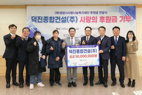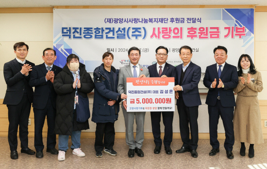 (전남=NSP통신) 김성철 기자 = 광양시는 지난 해 12월 27일 덕진종합건설(대표이사 김성은)에서 광양시사랑나눔복지재단(이사장 김재경)에 성금 5000만 원, 광양시에 고향사랑기부금 500만 원을 전달해 연말연시 지역사회에 뜻깊은 나눔을 실천했다고 밝혔다.