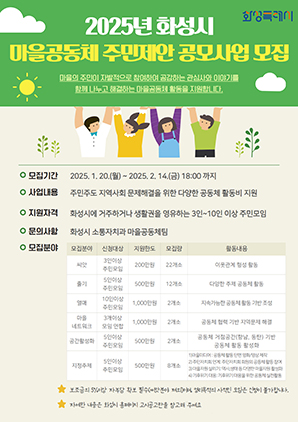 (경기=NSP통신) 조현철 기자 = 경기 화성시(시장 정명근)가 주민 주도의 마을문제 해결과 공동체 활성화를 위한 ‘2025년 마을공동체 주민제안 공모사업’ 참여자를 오는 13일부터 2월 14일까지 모집한다.