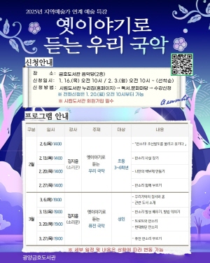 (전남=NSP통신) 김성철 기자 = 광양금호도서관은 오는 2월~3월까지 시민들을 대상으로 금호도서관 2층 음악당에서 지역 예술가와 함께하는 예술 특강 ‘옛이야기로 듣는 우리 국악’을 운영한다고 전했다.
