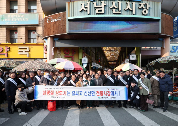 강은희 교육감을 비롯한 교육지원청 교육장, 직속기관장, 교육청 직원 등 교직원 170여 명이 서남신시장을 방문해 설맞이 제수용품과 식재료 및 생필품 등을 구매했다.