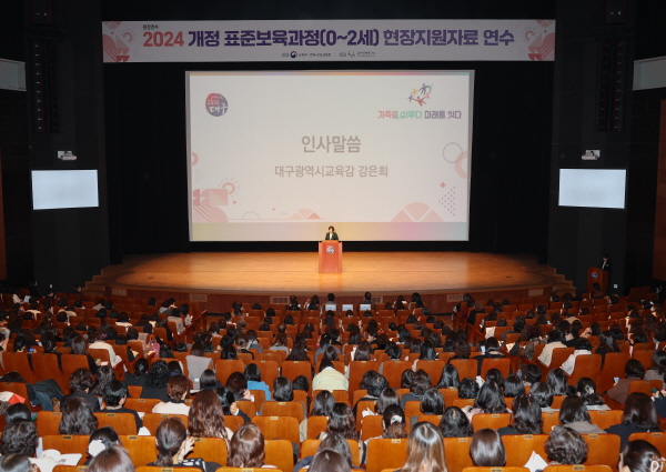 (경북=NSP통신) 김대원 기자 = 대구시교육청(교육감 강은희)은 지난 22일 대구학생문화센터 대공연장에서 어린이집·유치원 원장 1000여 명을 대상으로 ‘2024 개정 표준보육과정(0~2세) 원장 연수’를 운영했다.