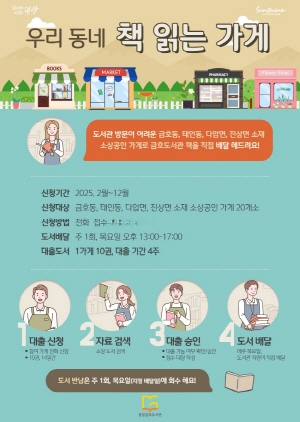 특히, 금호도서관은 올해 20개 가게를 모집하며, 한 가게당 10권의 도서를 한 달간 대출한다. 신청은 매주 월요일부터 수요일까지 전화로 접수하며, 목요일에 도서관 직원이 직접 가게로 책을 전달한다. 면 지역은 신청 후 택배 서비스를 통해 도서를 제공할 방침이다.