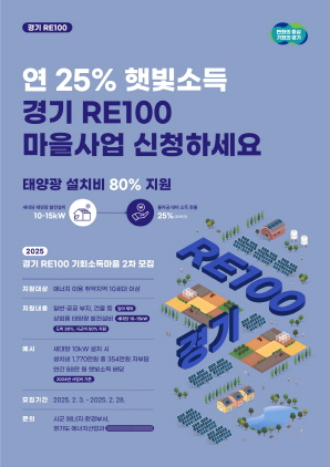 경기 RE100 ‘기회소득 마을’ 사업 참여 신청기간은 2월 28일까지며 ‘경기RE100 누리집 경기RE100이야기 게시판’에서 ‘기회소득 마을’을 검색해 사업계획서와 구비서류를 작성한 후 관할 시군 에너지 담당 부서에 접수하면 된다.