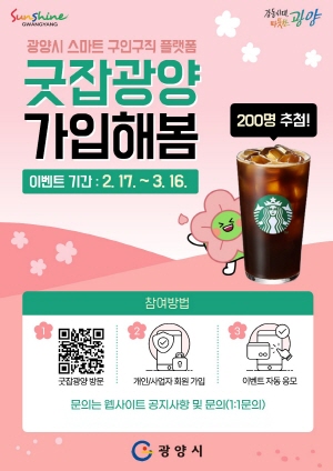 (전남=NSP통신) 김성철 기자 = 광양시의 일자리 종합 플랫폼인 ‘굿잡광양’에서 다가올 봄을 맞아 신규가입회원 대상 ‘굿잡광양 가입해봄’ 이벤트를 진행한다고 밝혔다.