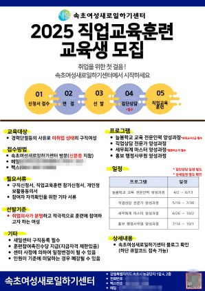 (강원=NSP통신) 조이호 기자 = 강원 속초시(시장 이병선) 속초여성새로일하기센터(센터장 김대중)가 2025년 직업교육훈련과정 교육훈련생을 모집한다.