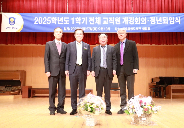 안양대는 27일 일우중앙도서관 아리홀에서 장광수 총장과 이태규 교학부총장, 장용철 대외협력부총장, 박남훈 기획처장, 한형서 총무처장, 그리고 퇴임자 가족과 교직원, 학과 교수 및 학생 100여 명이 참석한 가운데 박철호·한경일·이정관·마우리찌오 리오또 교수의 정년 퇴임식을 열었다.