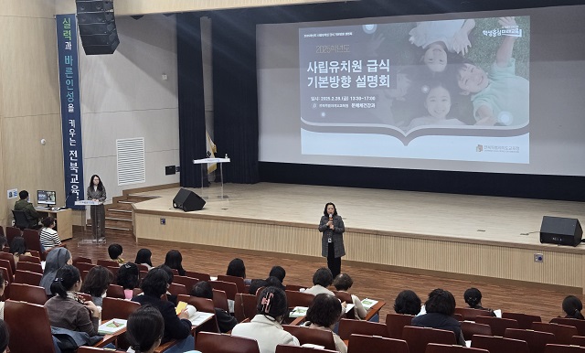 (전북=NSP통신) 김광석 기자 = 전북특별자치도교육청(교육감 서거석)은 사립유치원 급식 운영 안정화 및 품질 높은 급식 제공을 위해 28일 창조나래 시청각실에서 ‘2025 사립유치원 급식 기본방향 설명회’를 개최했다.