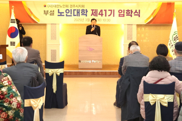 (경북=NSP통신) 조인호 기자 = 대한노인회 경주시지회 부설 제41기 노인대학 입학식이 11일 웨딩파티엘에서 개최됐다.