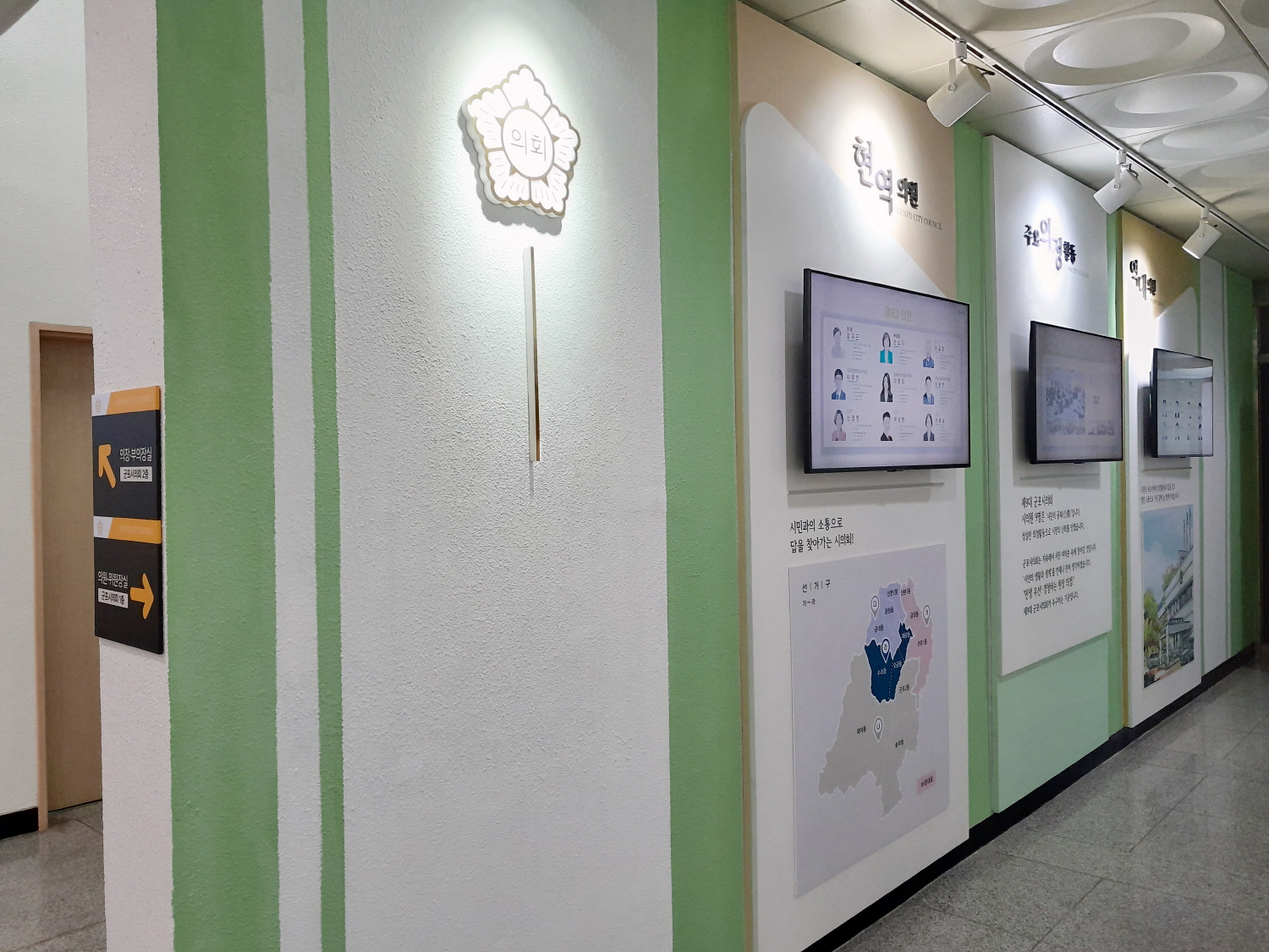 시의회에 의하면 최근 청사 1층 로비와 복도 공간에는 제9대 시의회 현역 의원과 주요 의정활동 소식 등을 영상 자료로 소개하는 홍보시설이 설치됐다.