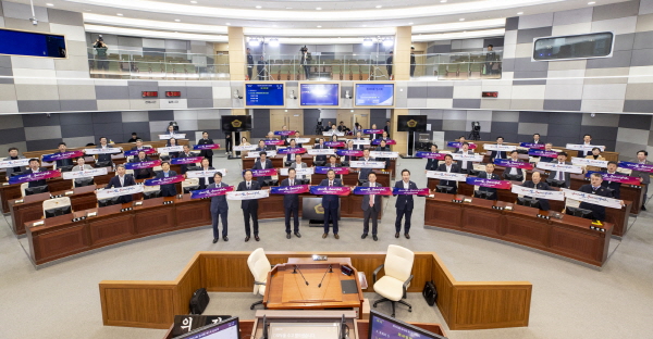(경북=NSP통신) 조인호 기자 = 경상북도의회(박성만 의장)는 2025년 구미에서 개최되는 ‘구미아시아육상경기선수권대회’의 성공적인 개최를 기원하며 제353회 제1차 본회의 종료 후 도의원 전원이 함께하는 퍼포먼스를 진행했다.