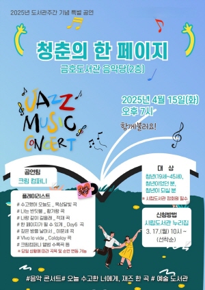 (전남=NSP통신) 김성철 기자 = 광양금호도서관은 도서관 주간(4월 12일~18일)을 맞아 오는 4월 15일 오후 7시에 감성 가득한 음악 공연 ‘청춘의 한 페이지’를 진행한다고 밝혔다.