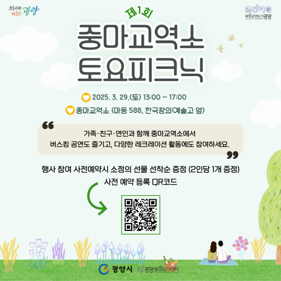 2025년 상반기 ‘토요피크닉’은 오는 3월 29일을 시작으로 7월 12일까지 매월 둘째주, 넷째주 토요일에 중마교역소에서 진행된다. 참석을 원하는 시민들은 광양문화도시센터 공식 인스타그램 등을 통해 참여 사전 등록을 할 수 있으며 사전 등록을 통해 참석한 시민들에 한해 소정의 선물도 제공할 예정이다.