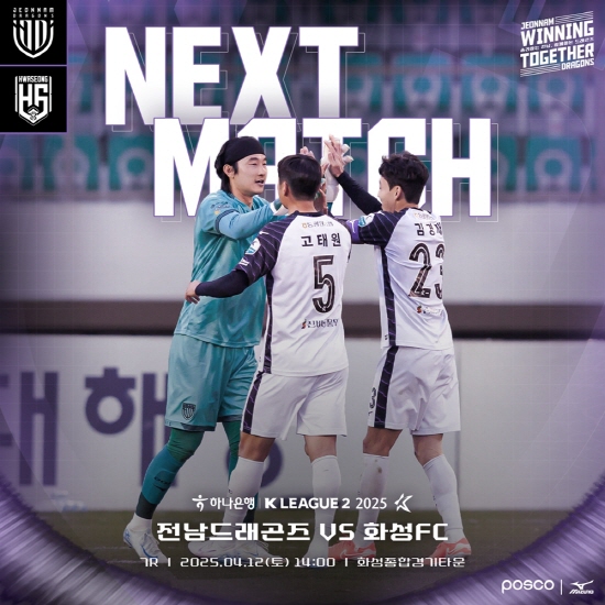 (전남=NSP통신) 김성철 기자 = 전남드래곤즈가 오는 4월 12일 오후 2시, 화성종합경기타운에서 K리그2 신예 화성FC와 첫 맞대결을 치른다.